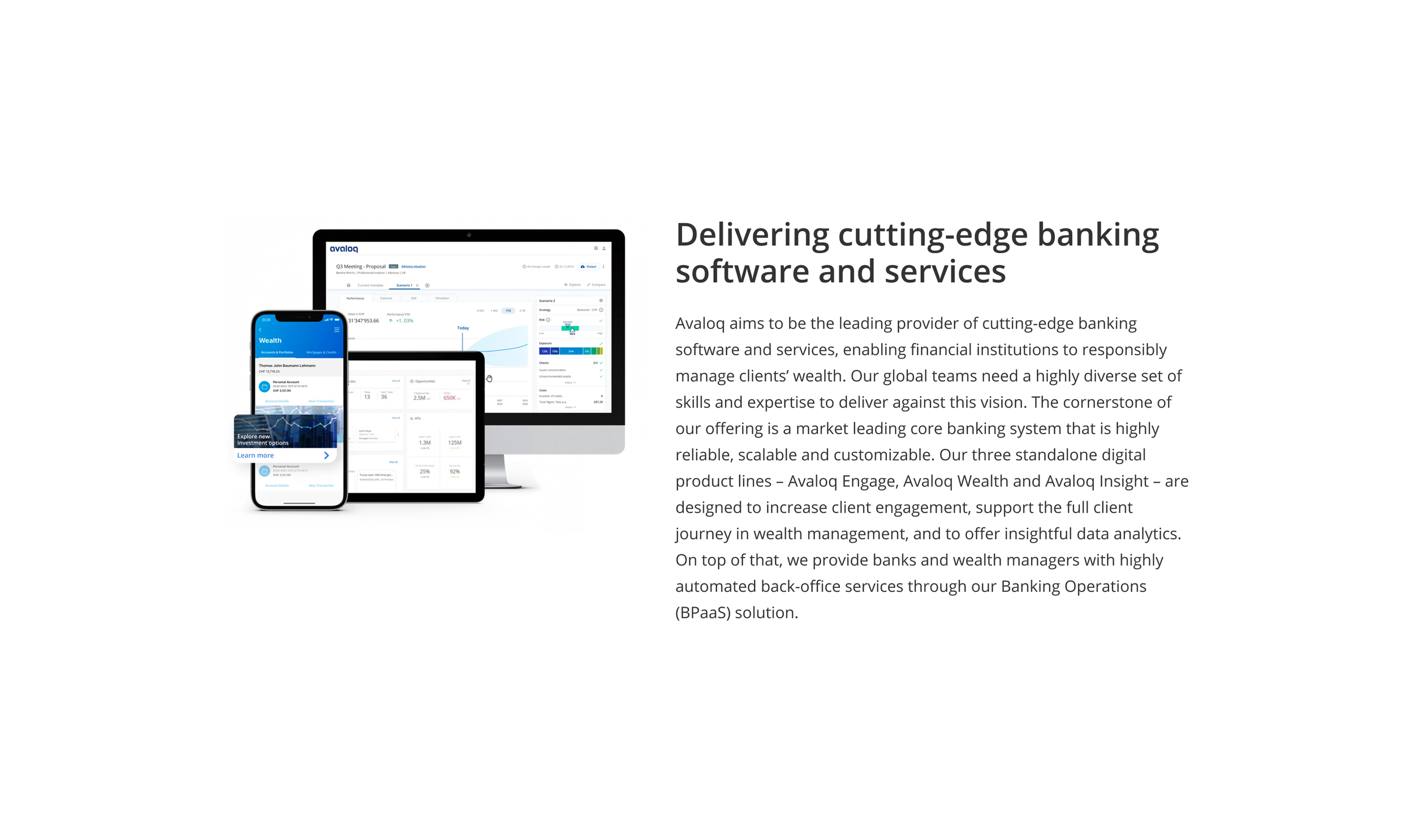 Avaloq is an industry-leading provider of wealth management technology and services for financial institutions around the world, including private banks and wealth managers, investment managers, as well as retail and neobanks. We are the only independent provider of digital banking solutions to both develop and operate its own software through cloud-based software as a service (SaaS) or on-premises models.